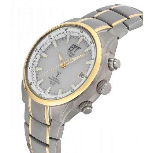 Bei dieser Uhr handelt es sich um ein Ausstellungsstück oder Fotomuster mit kleinen Lager- oder Gebrauchsspuren. Die Uhr ist technisch einwandfrei und ungetragen. Aus diesem Grund bieten wir diesen Artikel in unserer Schatztruhe zu einem reduzierten Preis an. Eine sportlich elegante Herrenuhr im bicolorem Design mit weißem Ziffernblatt und Solar-Funk-Antrieb, sowie Datumsanzeige. Die Eco Tech Time Solar Drive Herrenuhr EGT-11337-51M hat bis zu 6 Monaten Dunkelgangreserve. Das Gehäuse und das Armband der Eco Tech Time Solar Drive Funk Aquanaut II sind aus Titan.